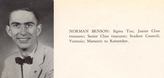 | Bio | LEBANON Norman Rex Benson, 71, died Wednesday, October 6, 2010, in the Good Samaritan Hospital, Lebanon. He was the husband of J. Elaine Lowderman Benson, to whom he was married 50 years. Born in Independence, Mo., on March 25, 1939, he was the son of the late Tom and Beulah Rex Benson. Norm was a 1957 graduate of Van Horn High School Independence, Mo., and a 1963 graduate from the University of Kansas with a degree in business. He served his country as a cold war veteran in the United States Air Force. After 30 years as a District Mgr. with South Western Bell, Norm became an avid astronomer. His children teased him and asked for individual horoscopes. He was a past president of the Dallas chapter Texas Astronomical Society, and a former member of the Kiwanis Club of Dallas, Texas. In addition to his wife, he is survived by two sons, Dr. Steve Benson and wife, Jean (Betty) of Ashland, Mass., and Lt Col Scott Benson and wife, Ranee of Acworth, Ga.; one daughter, Stacy Benson of Palmyra; and five grandchildren, Nikolas, Sophia, Mitchell, Matthew, and Joseph Benson. Norm was preceded in death by a grandson, Gabriel Benson. Memorial services will be held on Monday, October 11, at 12 p.m. at the Kreamer Funeral Home and Crematory, 618 E. Main St., Annville. Inurnment will be held at the convenience of the family. A visitation will be held one hour prior to the service from 11 a.m. to 12 p.m. at the funeral home. There will be no viewing. Contributions can be made to International Assistance Group, 531 Fifth St., Oakmont, PA 15139; or to the USO, P.O. Box 96860, Washington, DC 20077-7677. www.kreamerfuneralhome.com