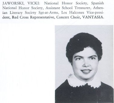 | Bio | Vicki L. Jaworski, 62, of Independence, MO, passed away Monday, November 7, 2005. A Mass of Christian Burial will be 11 a.m., Saturday, November 12, at St. Ann's Catholic Church (10113 E. Lexington Ave., Independence, MO); with interment in Mt. Calvary Cemetery. The Rosary will be said at 6:30 p.m., Friday, with visitation following until 8:30 p.m., at Carson-Speaks Chapel (1501 W. Lexington Ave., Independence, MO). Because of Vicki's interest contributions are suggested to St. Labre Indian School (Tongue River Road Ashland, MT, 59003), in lieu of flowers. Vicki was born November 18, 1942, in Independence, MO, to Adolph and Nadine Jaworski. She had retired as a Medical Technologist from the Veteran's Hospital after several years. Recently she was a Youth Friend at Procter Elementary School; and taught English as a second language in the adult education program at Truman High School. Vicki is survived by her mother, Nadine Jaworski of Independence, MO; sister, Donna Burgess of Independence, MO; several nieces and nephews. (Arrangements: Carson-Speaks Chapel)